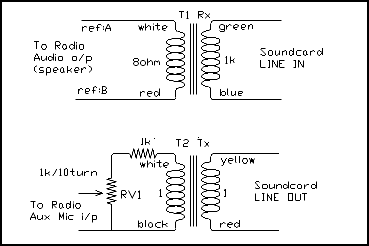 Whilst some people have achieved success by connecting their audio lines directly, I chose to isolate my sound card from the radio by means of small audio transformers, using the following circuit: