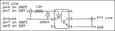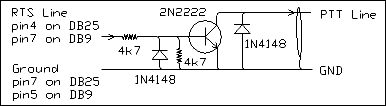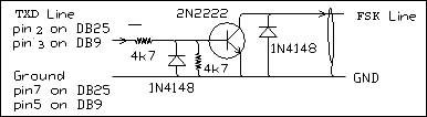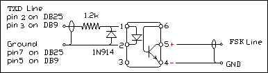 For radios with a built-in FSK/RTTY mode, an additional switching circuit can be employed to control the FSK switching line. This circuit will be identical to the above circuits, with the exception that it will be connected to the TxD line and Ground (Pin 3 and Pin 5 respectively on a DB9 Connector).