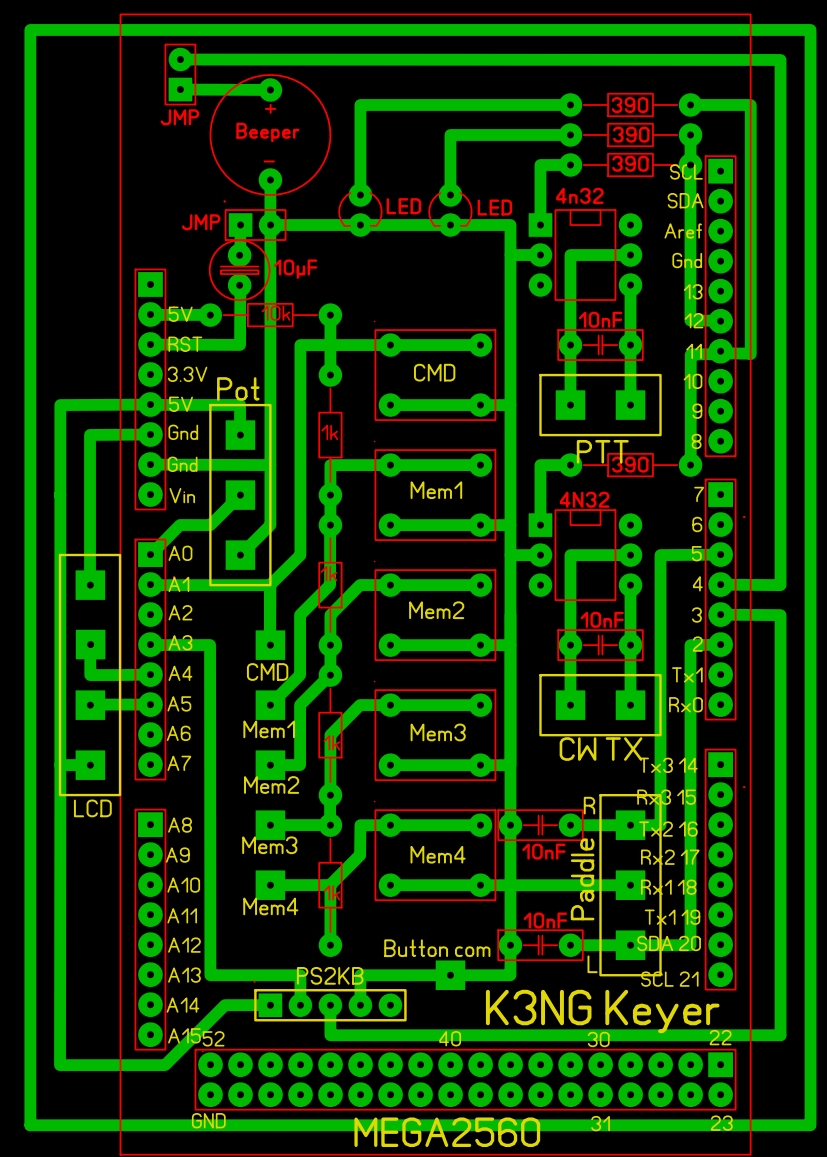 The Keyer itself is a Shield board fitted to the Arduino. A full-sized image can be downloaded here