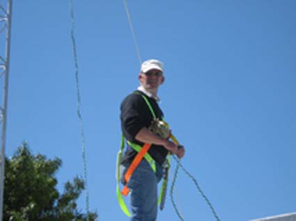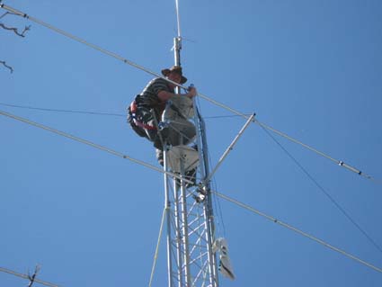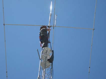 After considerable effort by Glen and Basie, the A3S was finally affixed to the pole, and the LMR400 feedline was attached. Considerable effort went into aligning the two antennas correctly, and it was noticed that the A3S' director had been knocked out of it's horizontal position during the raising of the antenna. The judicious use of a long pool net soon straightened this out! At last both antennas were successfully installed!