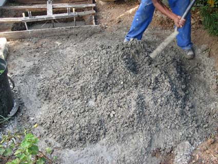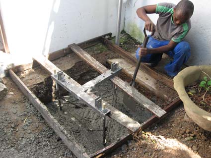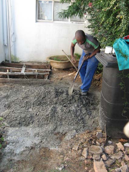 As planned, on Saturday 13 March 2010 Elton arrived to mix the concrete for the base. This landed up being a much bigger task than anticipated. The 3 50kg bags of cement did not go very far, and a further 4 bags had to be purchased!
