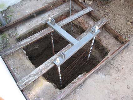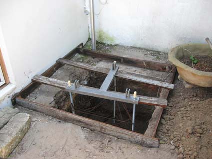 Months dragged by as I tried to determine where I wanted to erect the tower, and pondered on how the tower would be raised. Finally in late 2009 a decision was reached, and I began to look at getting the project under way. The first step was to get a base support "cage" assembled. Basie ZR2BA stepped in, and in February delivered the base assembly cage. Glen ZS2GV and his assistant Elton assisted with the digging of the hole - an impressive 1.1m X 1.1m wide, 1.2m deep pit alongside where my WARC band beam stood. A copper strip (provided by Andre ZS2ACP) was buried around the perimeter of the hole, with a lead attached for connection to the earth spike. A wooden frame was assembled around the hole, and the base cage suspended in place, ready for the concrete to be thrown.